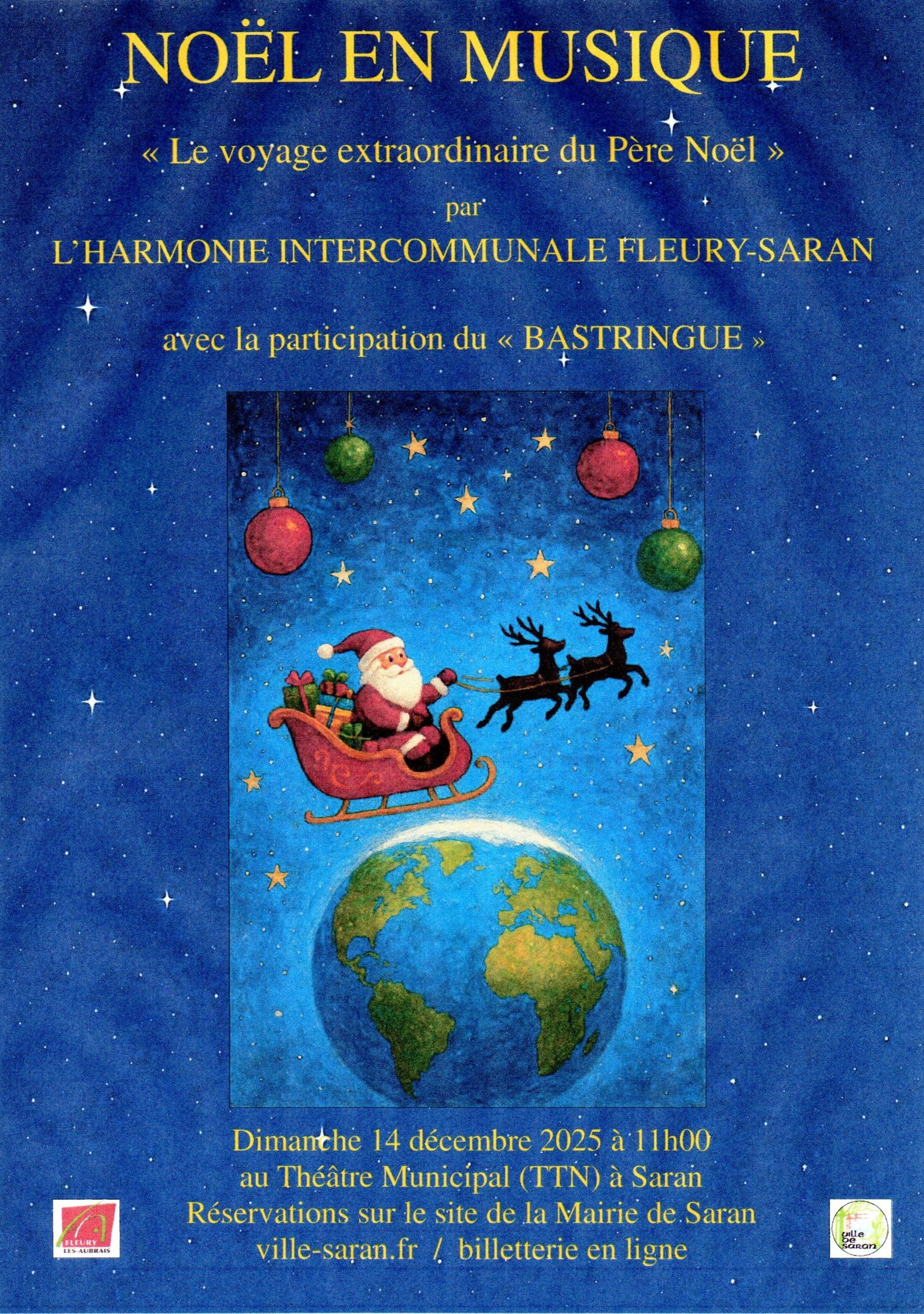 Théâtre municipal de Saran Réservation obligatoire sur le site de la mairie de Saran ![]() Le même concert sera donné le samedi 20 décembre 2025 au théâtre forain d'Artenay à 16 heures. |